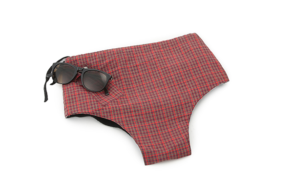 男性が赤を身につけるなんて、と言われる時代に、おしゃれな赤いチェックのニット地の海水パンツを作ったのだった。サングラスをひっかけるパーツ付き。